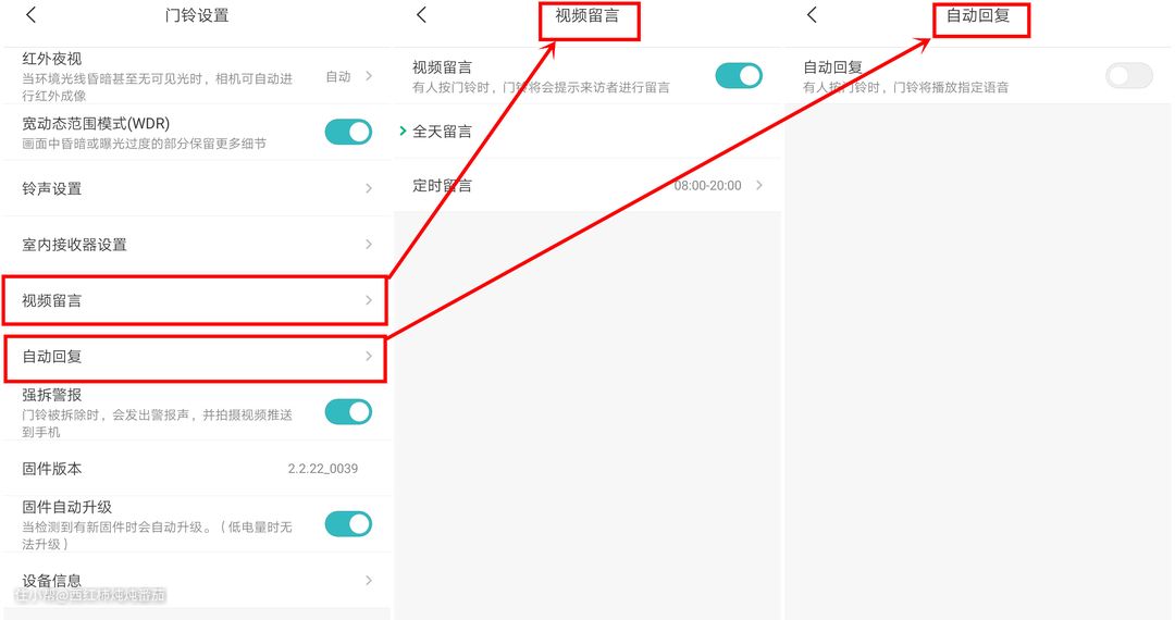除了上述对门外动态的监控,在 APP中,用户还可以设置视频留言以及自动回复 ▲