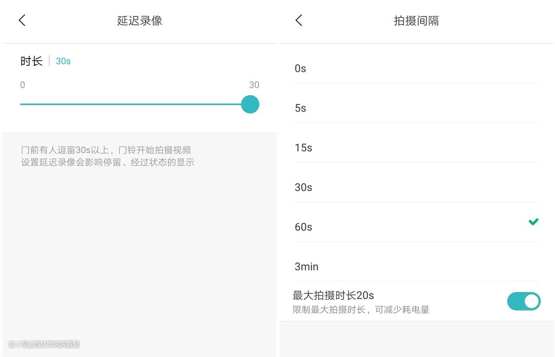 开启该功能后,如果邻居在 30s内完成回家/出门动作,是不会被楼主的这款叮零S智能门铃记录下来的;而如果对方在楼道间停留时间超过 30s,那么门铃就会进行拍摄,拍摄时长 20s。此时因为楼主对拍摄间隔进行了设置(60s),所以在 30+20=50s之后的 60s时间内,是不会拍摄第二段视频的——也就是说,如果对门的邻居在楼道间停留时间不超过 1min50s,只会被记录一段 20s左右时长的视频推送到楼主手里。