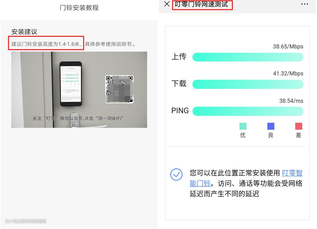 官方对于门铃的安装高度有一个建议,在 1.4-1.6米之间,并且微信公众号中有网速测试工具,用来确认设备能否在当前网络环境下正常工作 ▲