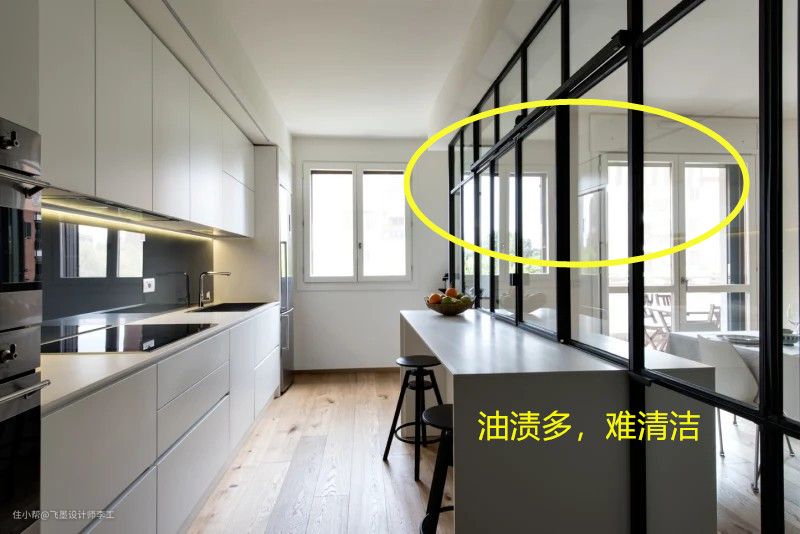 当然设计师也提醒到,利用玻璃隔断墙分隔岛台的设计也有弊端。