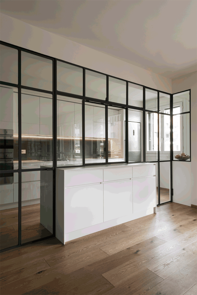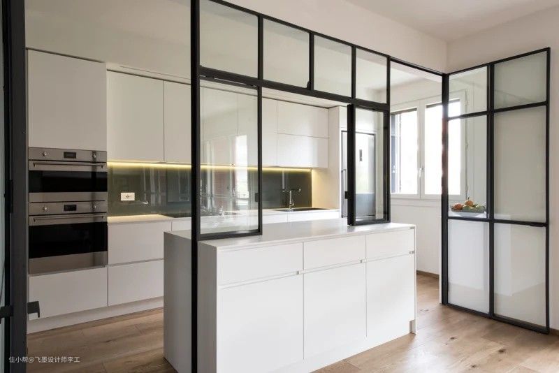 首先横跨岛台整面钢制玻璃墙,让厨房与其他功能区分隔,而且透明的钢制玻璃隔墙,让厨房与其他功能区之间有“隔而不断"的效果,视觉上可以说是整个开放式空间,空间感更强,这种整面玻璃隔墙很适合小户型或开间户型。