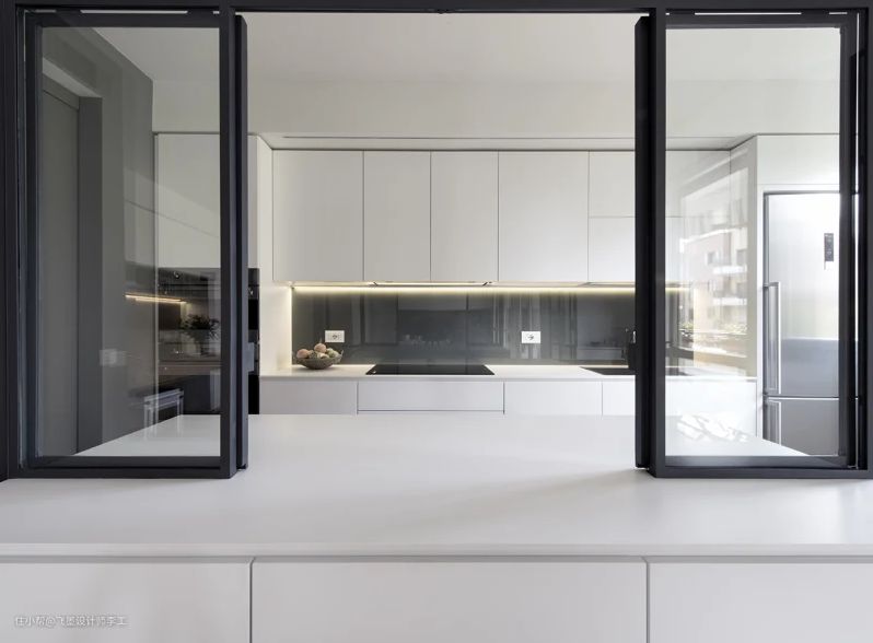 最后这整面的玻璃隔断墙,基本上能够开启三分之二,这样打开的时候,可以说是一个完整的开放式厨房,关上又是封闭厨房,当烹饪炒菜的时候,完全关闭,能够很好的阻止油烟蔓延到其他的功能区。