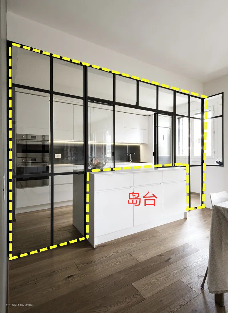 整体厨房布局是:厨房里设置岛台,然后直接横穿岛台,做钢制玻璃隔断墙。这样既实现了我对岛台的需求;透明钢制玻璃墙,在视觉上也满足了我对开放式厨房的追求;更重要的是满足了对于封闭厨房的规定。