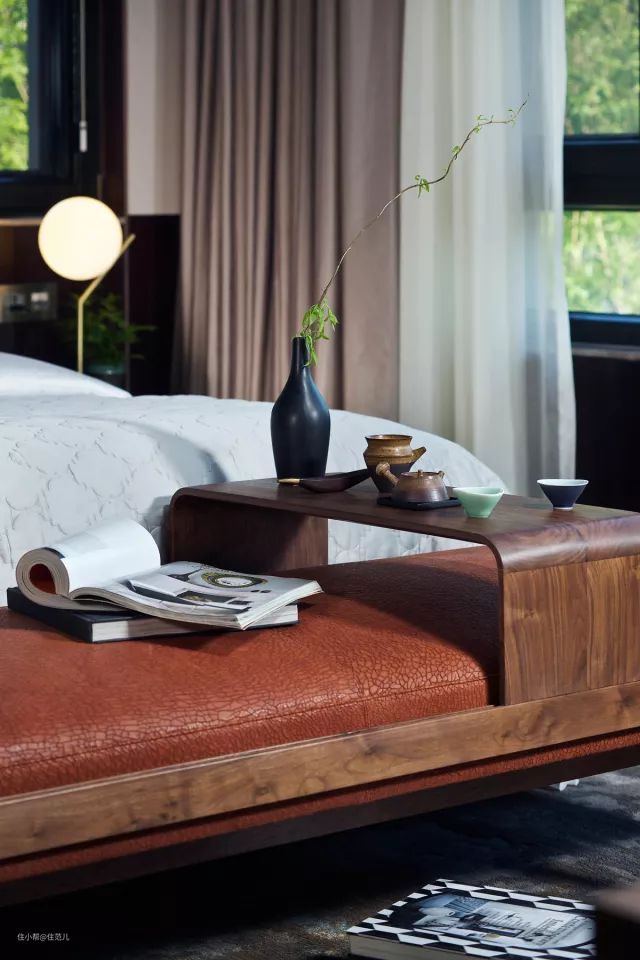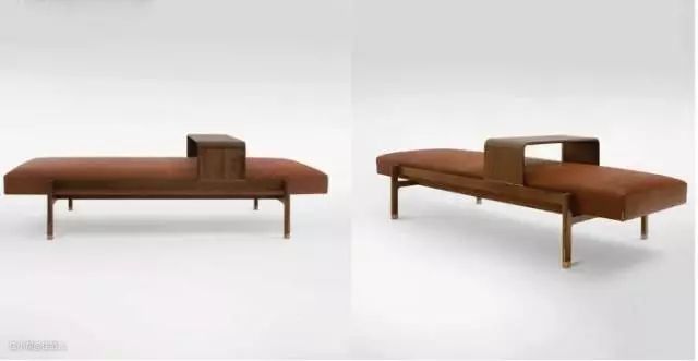 几年前的作品也许能被归为“新中式”,但大瑞老师近来的作品融合的元素显著增加,再也难做简单粗暴的风格划分。比如这款榻,它的小桌子可以沿着滑轨移动,外表泛着幽亮的皮质光泽,颇有摩登现代感。原型却是设计师在朋友家看到的红木罗汉床。
