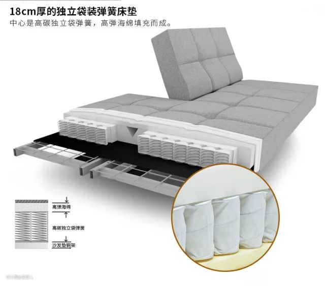 预算充足,就可以用钢结构框架和独立弹簧的沙发床了,首先钢框架更加稳固,使用寿命也更长。独立弹簧则是高档床垫的标配,你家沙发床的睡眠体验可能会比床还好。
