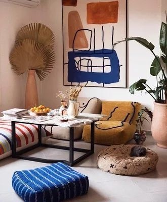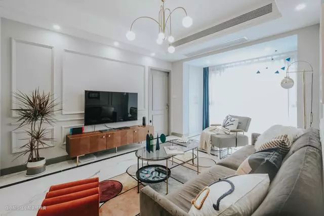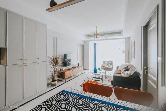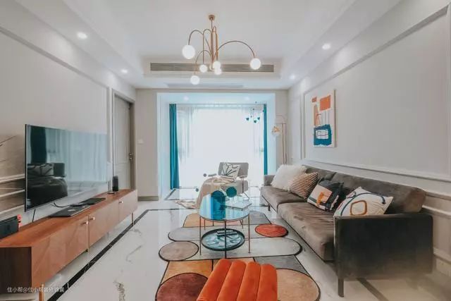 沙发深色调是为了压下客厅的浅色,增加厚重感,橙色的矮墩凳凸出局部色彩,增加亮点,茶几也是按照餐桌餐椅的思路,买可以通透空间的就好啦。