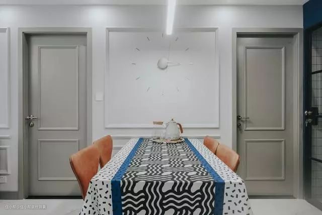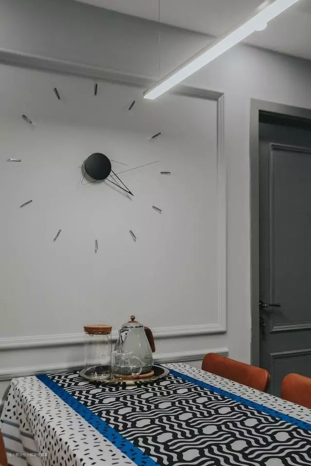 餐厅摆放的家具都很简单,尽量要求能透过物体看空间,所以餐桌和餐椅都是几根线条搭配座椅,桌布是我淘了很久的,几何线条系列,质感很舒适。