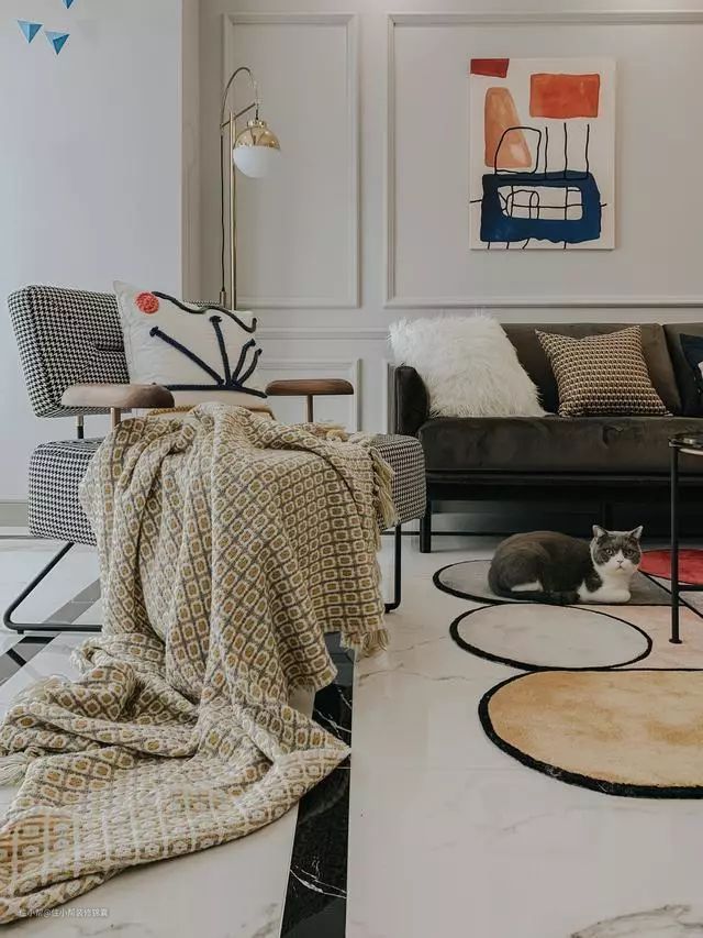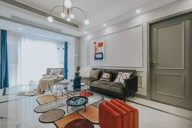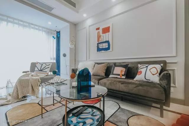 客厅主题基调以浅色系为主,灰色的墙面和大理石纹的地砖,色彩的丰富更多是通过家具软装突出,如果以后想换种感觉,直接更好家具就好了,方便。