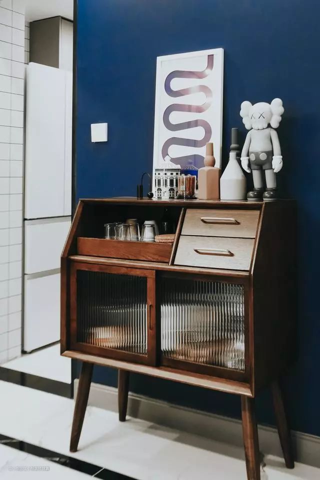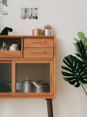 玄关胡桃木色的斗柜,三个区域划分合理,滑轨托盘放置杯子,抽屉放置刀叉勺子,橱窗放置大一点锅碗,非常好用,超级种草。