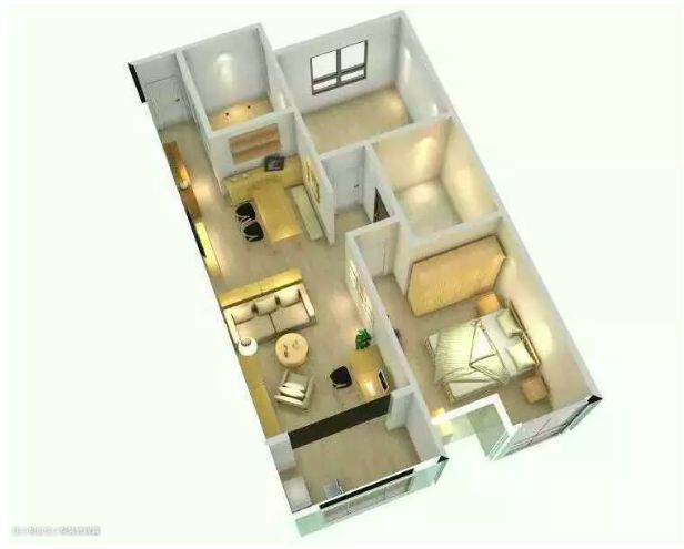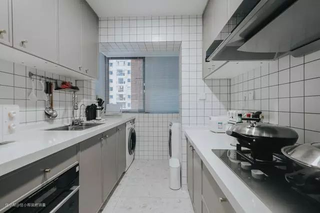 解决方案:打通阳台墙体,扩大厨房面积,置入烘洗一体机,保留阳台。