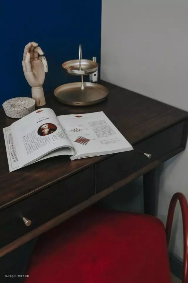 打开主卧房门,红色梳妆凳的色彩成了房间的亮点。