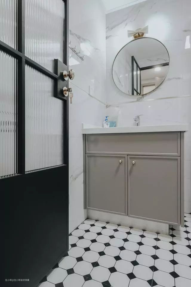 主卫做了淋浴隔断,鉴于空间就没有买带收纳的镜柜,只是单独的圆镜既好看又实用。