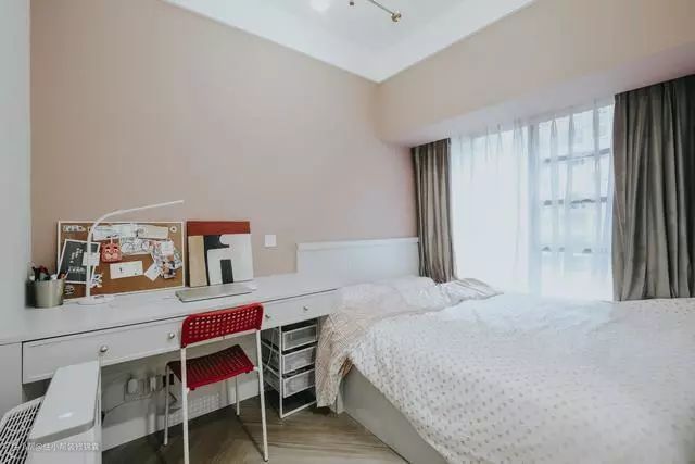 榻榻米与飘窗台是做了齐平,这样看就跟一张床一样了,背面设计靠背板,方便打扫也美观,同时书桌定制跟床体一致,尺寸合适。