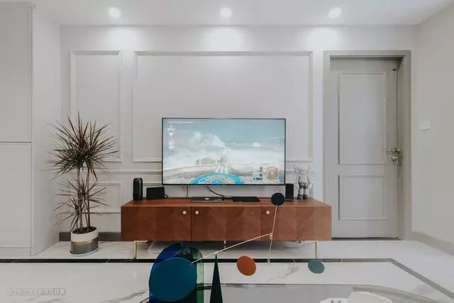 次卧在客厅空间的另一侧,由于是承重墙,所以没办法去重新设计空间布局,不然会将门开在旁边的储物柜位置,电视墙就能形成整体了。
