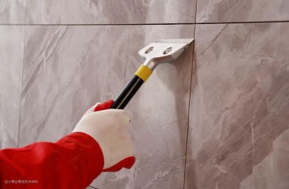 用压缝工具将瓷砖缝隙压平。压缝板会让美缝剂与瓷砖齐平,压缝球会让美缝剂带有下凹的弧度,按照自己的喜好进行选择即可。在不同的区域也需要使用不同的工具,阴阳角压缝就有专门的工具,和平面是不同的。