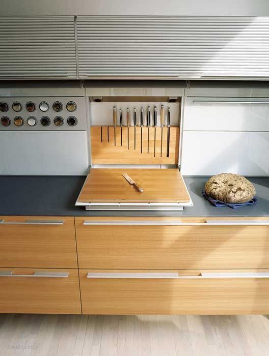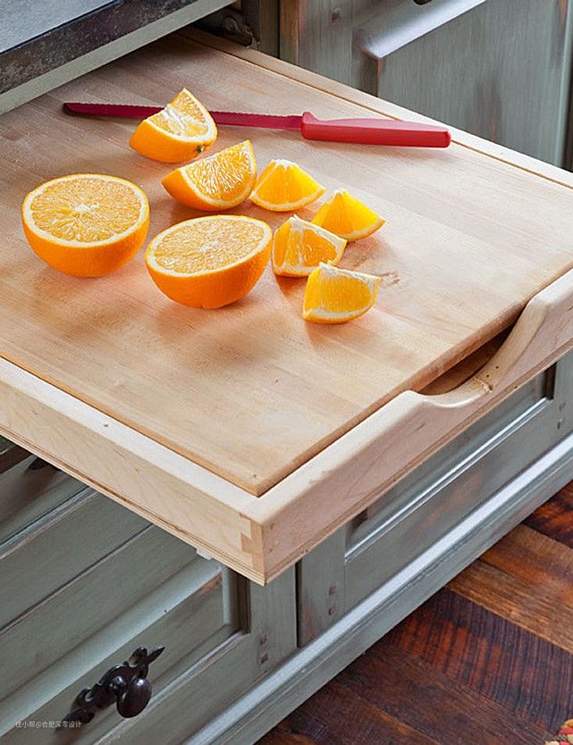 当然,像上面两张图片那样的确不错,但是你家的厨房必须足够大才行,那些小厨房就没有办法了,那么我们可以空出一个橱柜设置成抽屉式切菜板,不打开谁都发现不了。