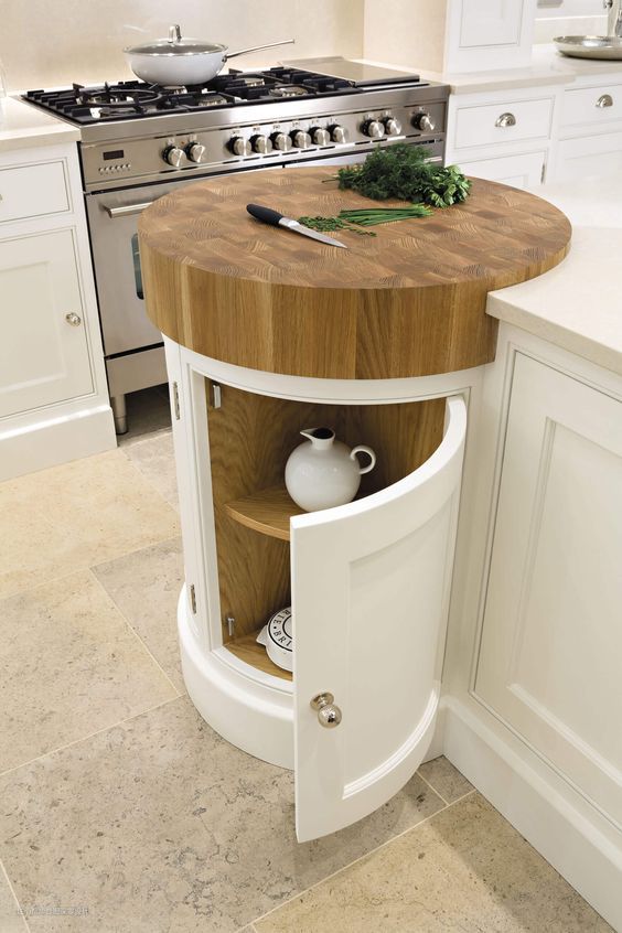 岛台的主要功能就是备菜,利用边角设置一个这样圆形的切菜板,充分发挥岛台的作用,还不容易磕碰,下面还能用来储物。