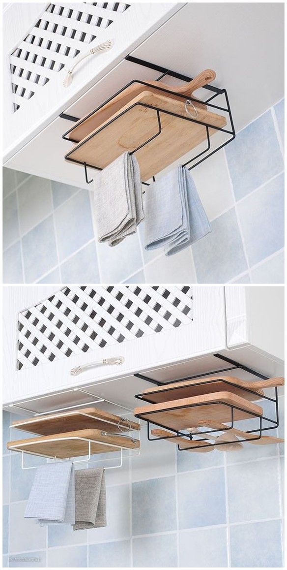 这种方法并不是所有的家庭都能够用得上,那么这一种就没有问题了,买个置物架挂在门上或者厨房的吊柜上,下面还能放上几条抹布,收纳和控水两不耽误。