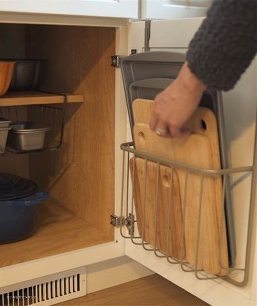 但是这样放切菜板离地面比较近,很容易粘灰惹尘,觉得不干净卫生,那么干脆就收在柜子里,利用橱柜柜门用个双面挂钩、或者按个收纳篮这样还不占用内部空间,省事!