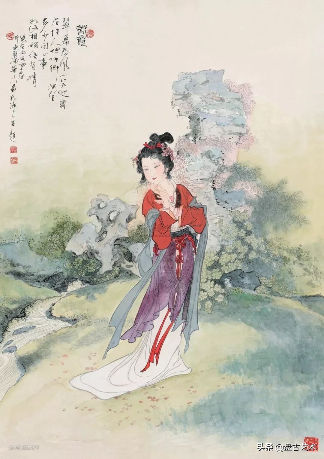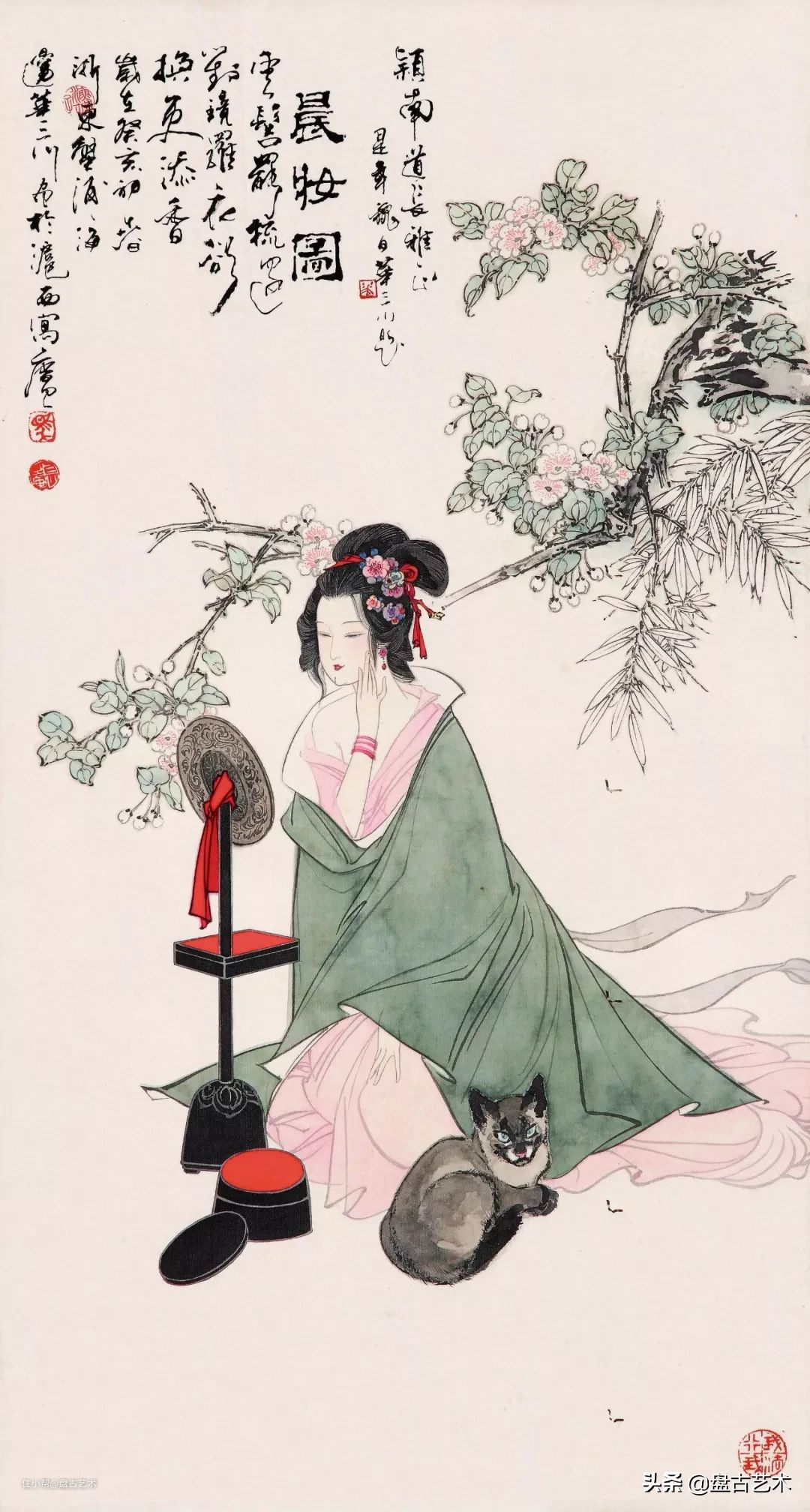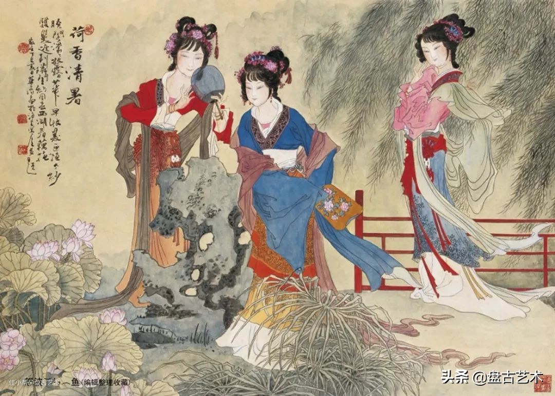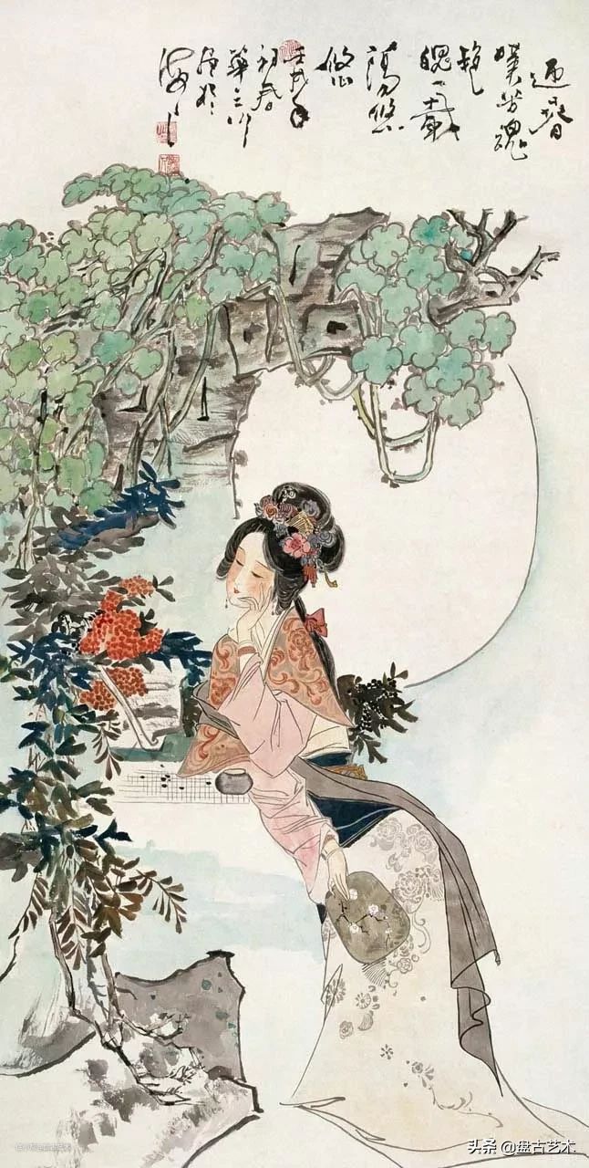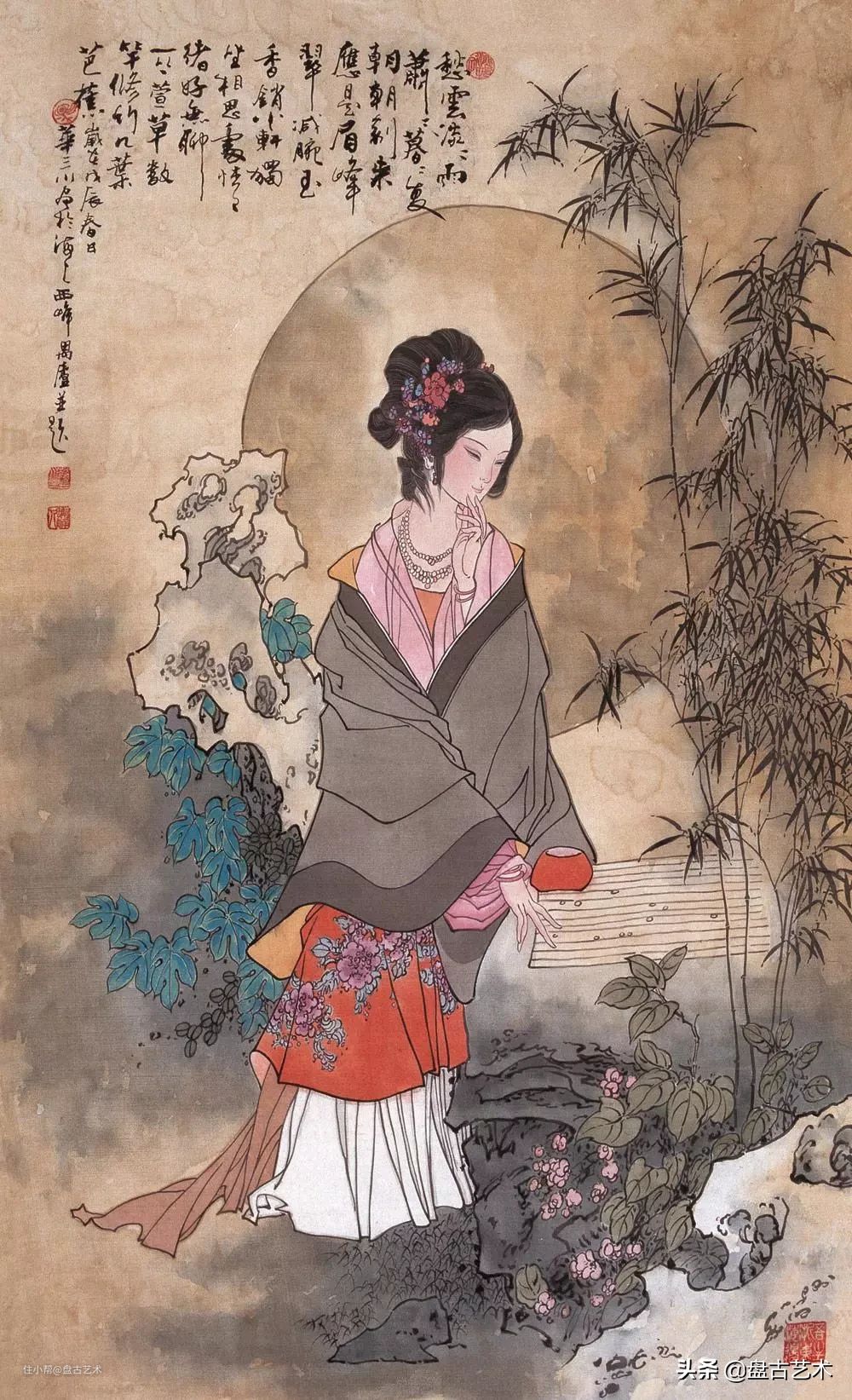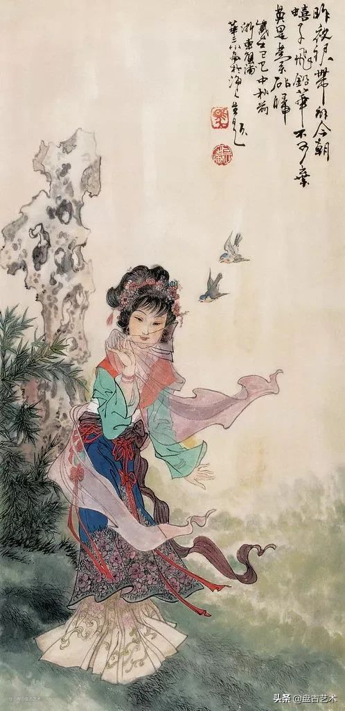 华先生的画在色彩上继承了传统工笔人物画的技法,也融会吸收了西洋水彩画的表现技巧,中西合璧相得益彰。他笔下的仕女或美女,以其曲雅和恬静、灵秀和质朴的艺术品格,摆脱了旧式仕女画过于华丽和甜腻的习俗,有一种超然脱俗的凝重之同和优雅飘逸的灵动之气。