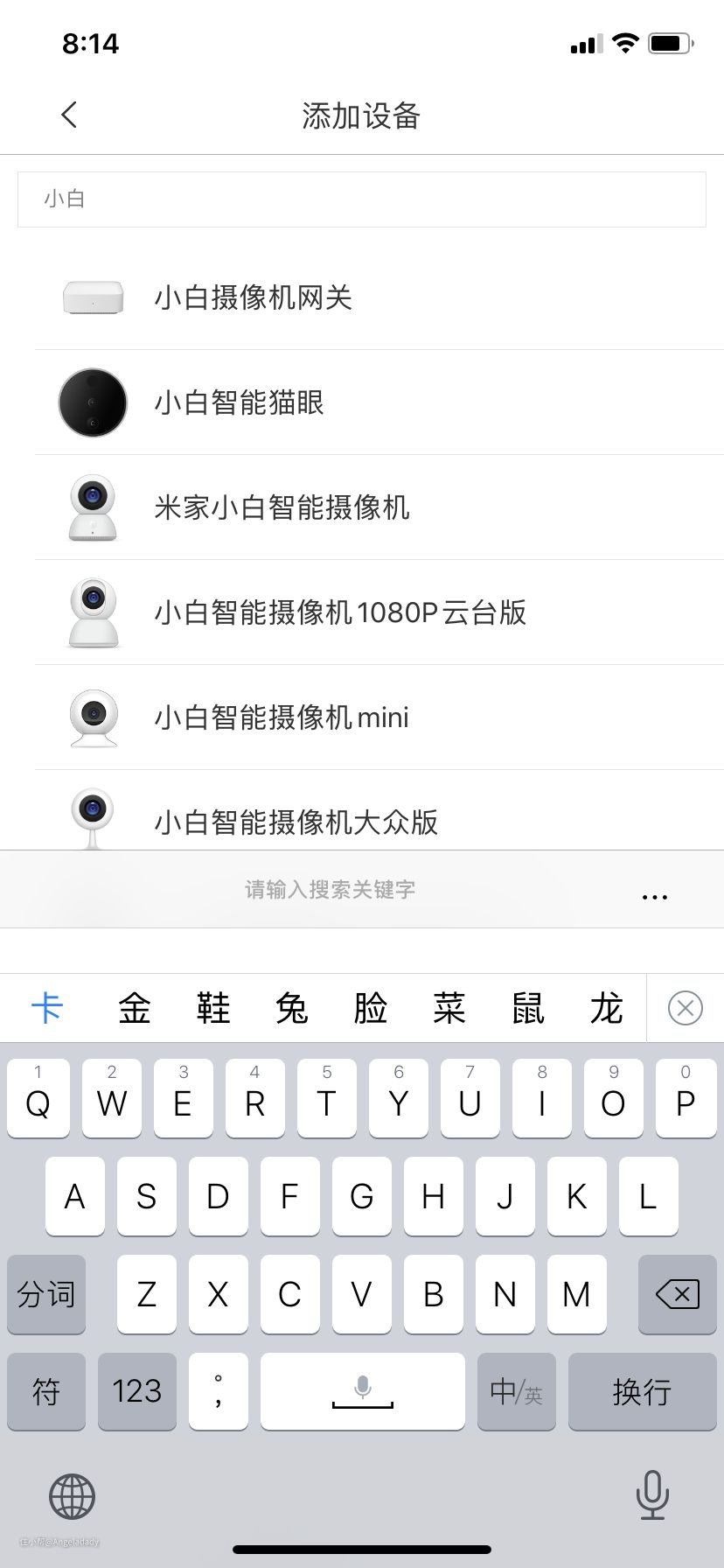▲打开米家APP,点击右上角+号,搜索小白智能猫眼。