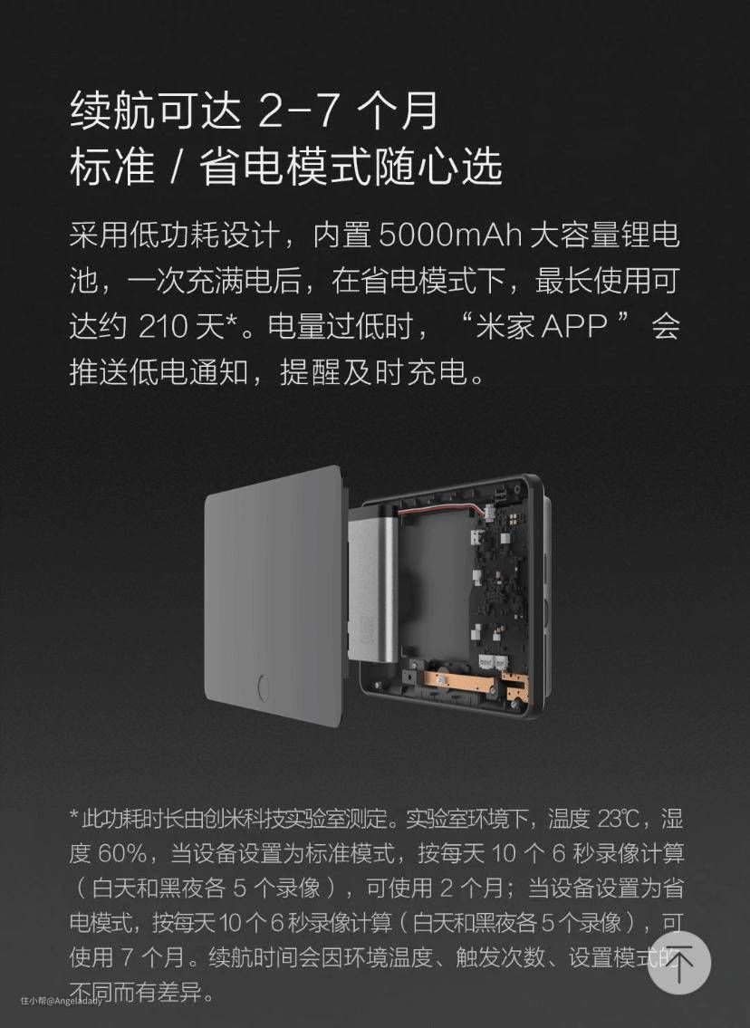 •采用低功耗设计,内置5000mAh大容量锂电池,充满电后,在省电模式下,最长可使用7个月,电量过低时,米家APP会及时提醒充电;