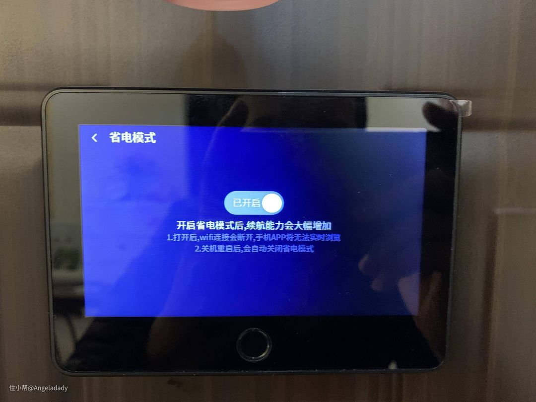 猫眼设置中,可查看当前显示屏电量;浏览电量提醒;开启省电模式,WiFi连接会断开,手机APP无法实时浏览,但续航时间将大大增加。