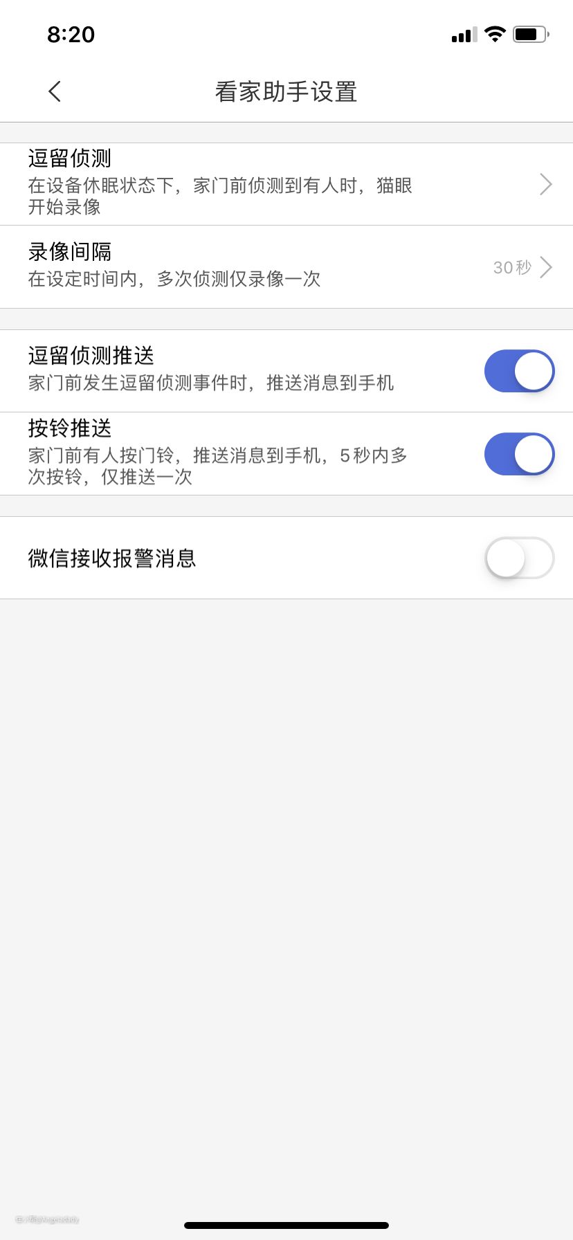 •小白可设置省电模式,当有人在门外停留较长时间时,会拍摄短视频并推送报警信息给手机;当家中无人时,要是有小偷准备撬锁进入时,小白拍摄的视频能及时提醒主人,有人准备闯入家中,可及时报警。视频也可作为证据交给警方;