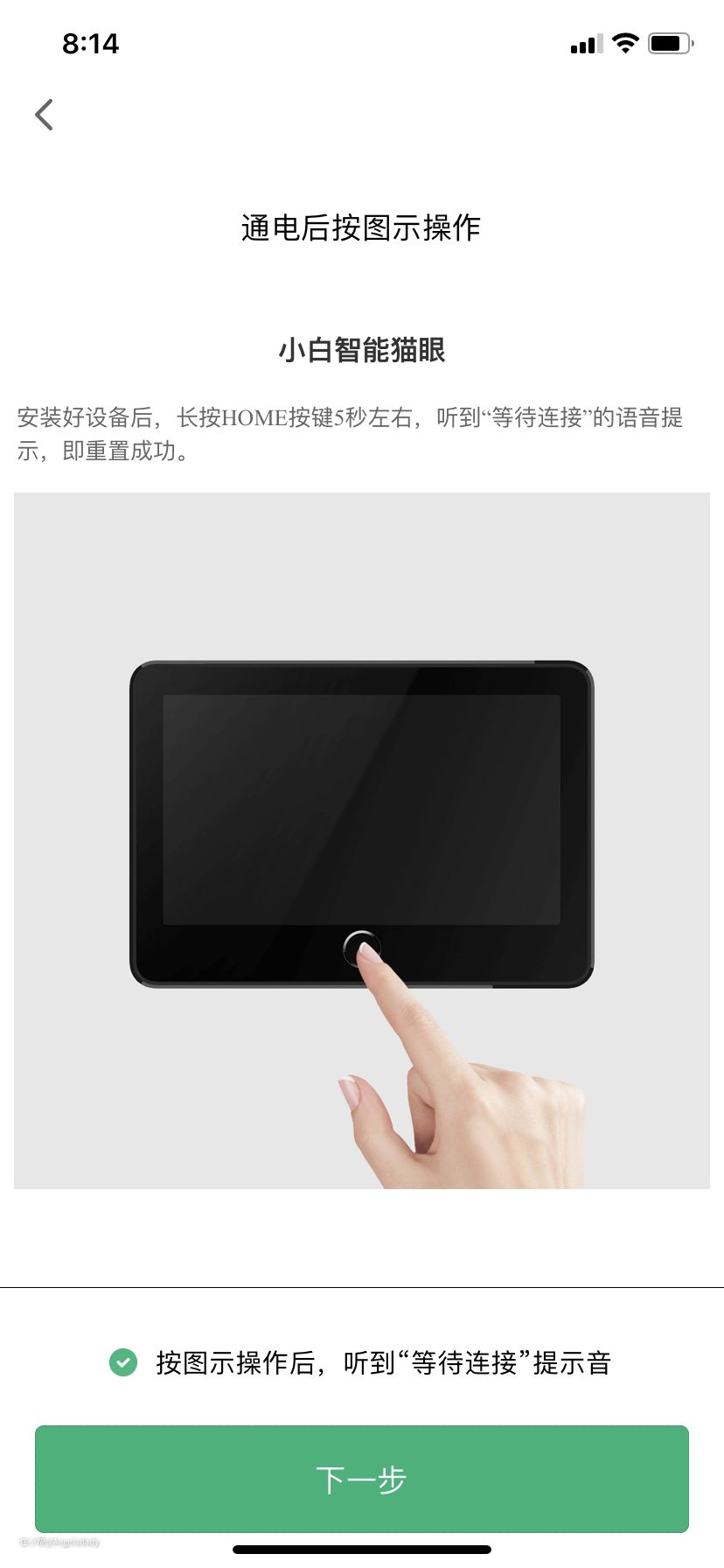▲接下来是连接小白了,按住小白显示屏HOME键5秒以上,直到听到“等待连接”提示音,点击下一步。