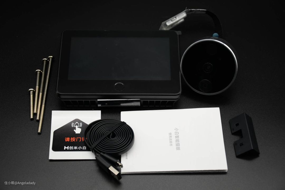 ▲都在这了,全家福来一个。安装螺丝、显示屏、猫眼摄像头、说明书、显示屏支架、充电线、门铃贴纸以及排线盖板,仔细看了一下,各个组件的做工都很不错。