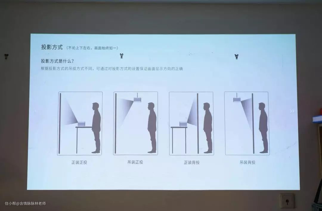 支持多种安装模式,比如说正装正投,吊装背投,正装背投,吊装背投等等。米H3也支持四种投影模式。