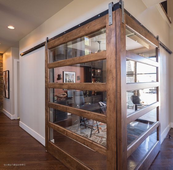 吊轨门在室内装修中是很常见的,将轨道安装在墙顶面上,然后安装玻璃或实木门都可以,通过顶面轨道实现开合,从而分隔功能区。