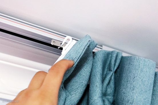 这里需要注意的是,单边窗帘的最两边的挂钩,最靠墙的那个需要挂在窗帘杆最边上的固定挂钩上,最靠中间部位的那个需要挂在窗帘轨道动力滑块上,这样才能拉动后面的滑块进行开关窗帘,千万别搞错了。