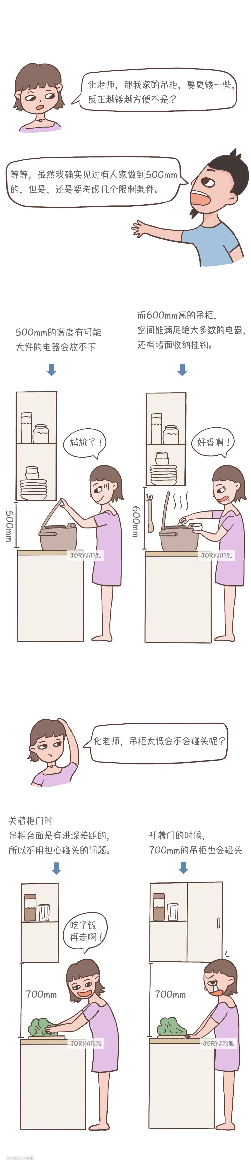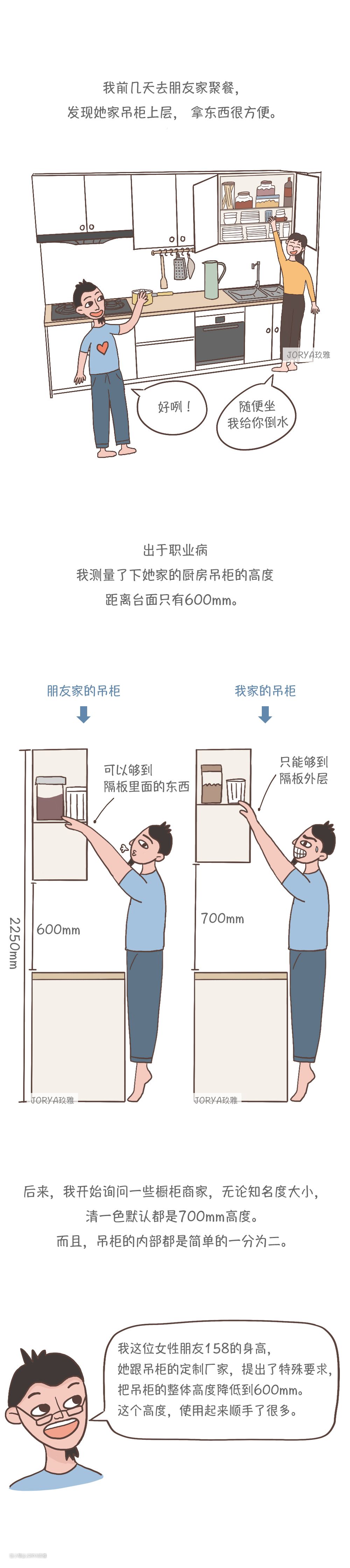 后来,我开始询问一些橱柜商家,无论知名度大小,清一色默认都是700高度。而且,吊柜的内部都是简单的一分为二。我这位女性朋友158的身高,她跟吊柜的定制厂家,提出了特殊要求,把吊柜的整体高度降低到600。这个高度,使用起来顺手了很多。