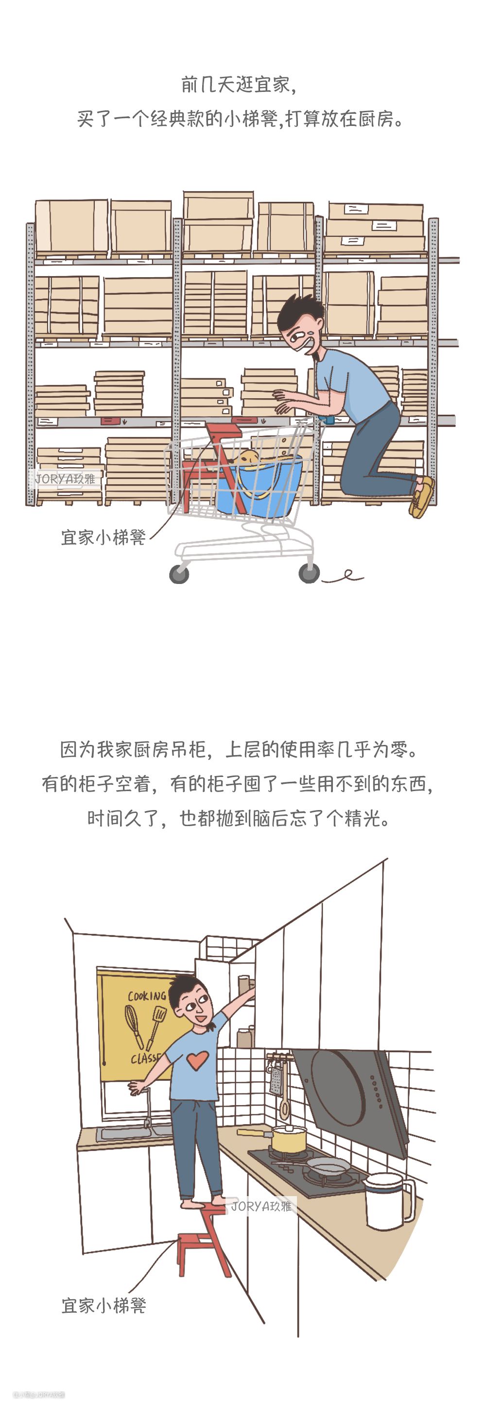 还没完,我这个朋友家的吊柜分层方式也值得借鉴~ 她们家的吊柜,并没有简单粗暴的从中间一分为二。朋友小钟说 “ 如果简单的一分为二,不仅一层浪费空间,第二层的隔板就会更高,对我这种矮个子不是很友好。”