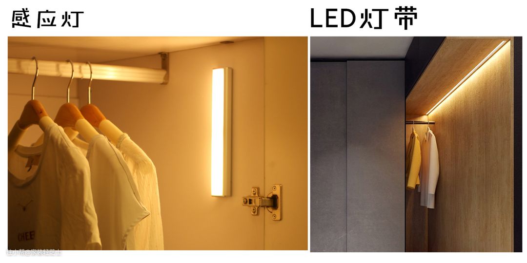 如果衣帽间里面光线不够,可以在某宝上购买人体感应灯或者隐形灯带就能解决这个问题啦!(感应灯价格50-100元/个)