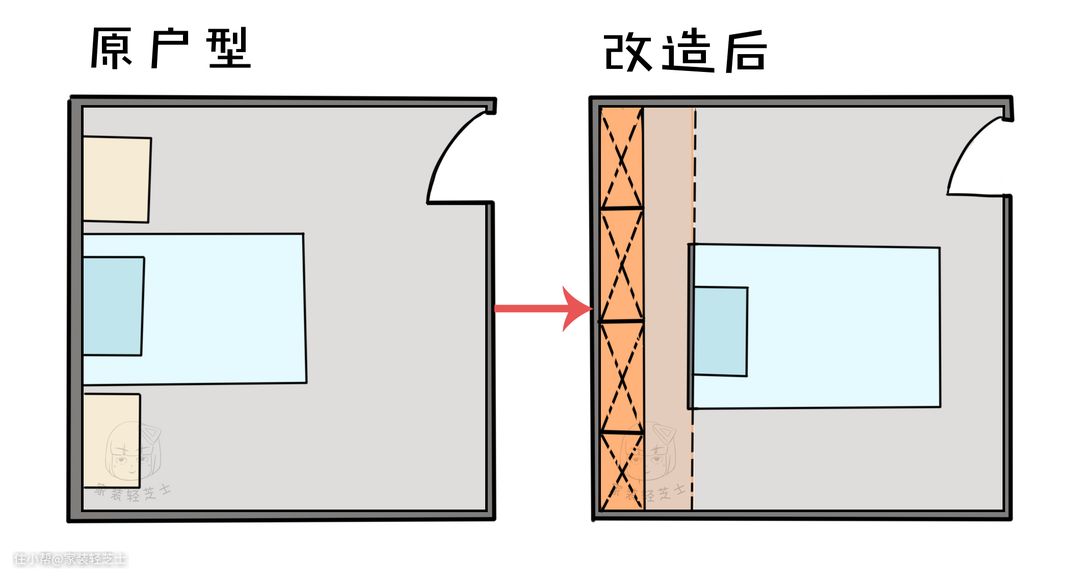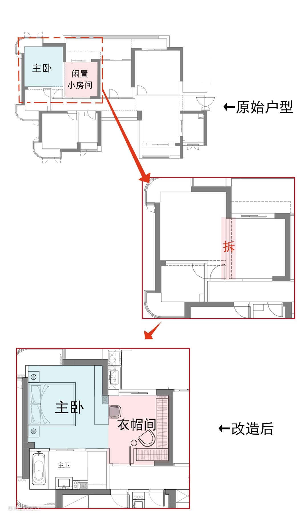 如果都满足了,我们就可以将非承重墙砸掉,将小房间并入主卧,增大主卧的实际面积,变出一个衣帽间啦!