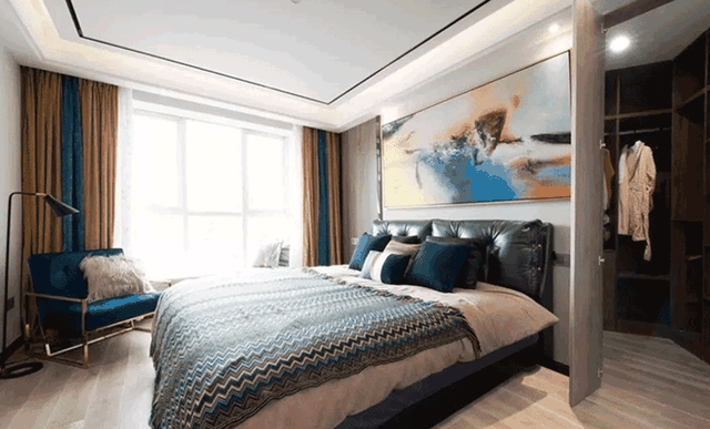 户型是正方形,不能用双排柜子隔出衣帽间,怎么办?我们可以移床!利用床与墙体的空间,隔出一个衣帽间。