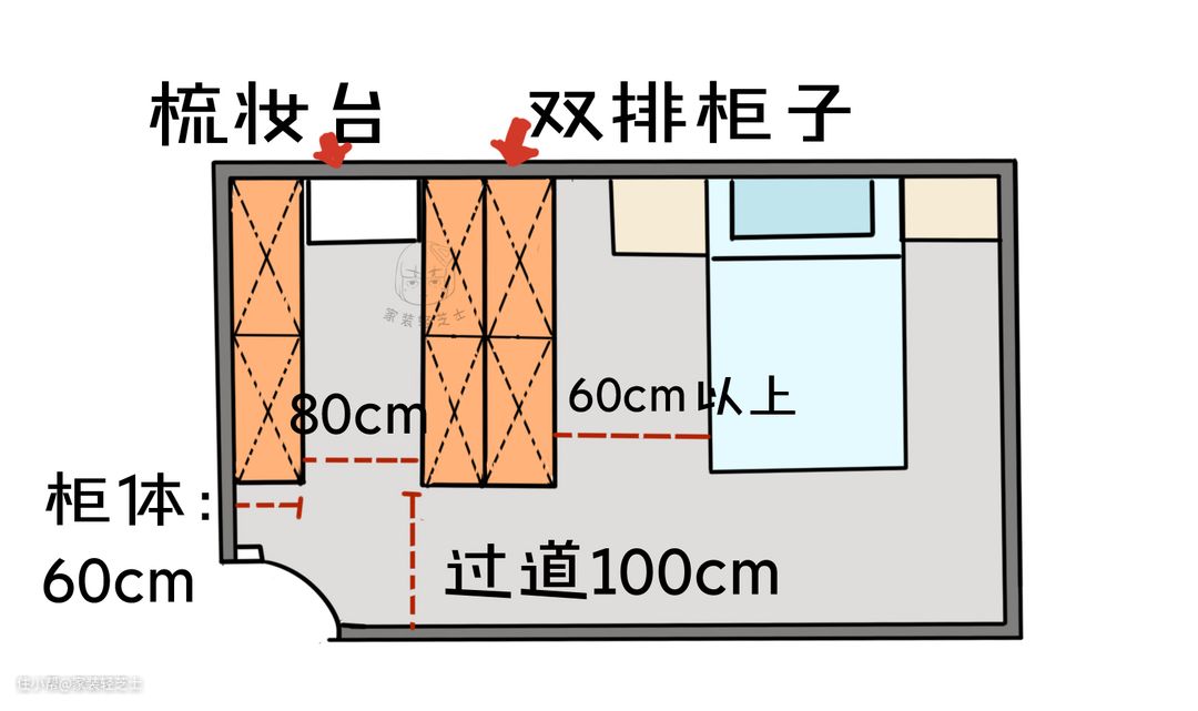 如果剩余空间较宽裕,可放下三排衣柜和梳妆台。