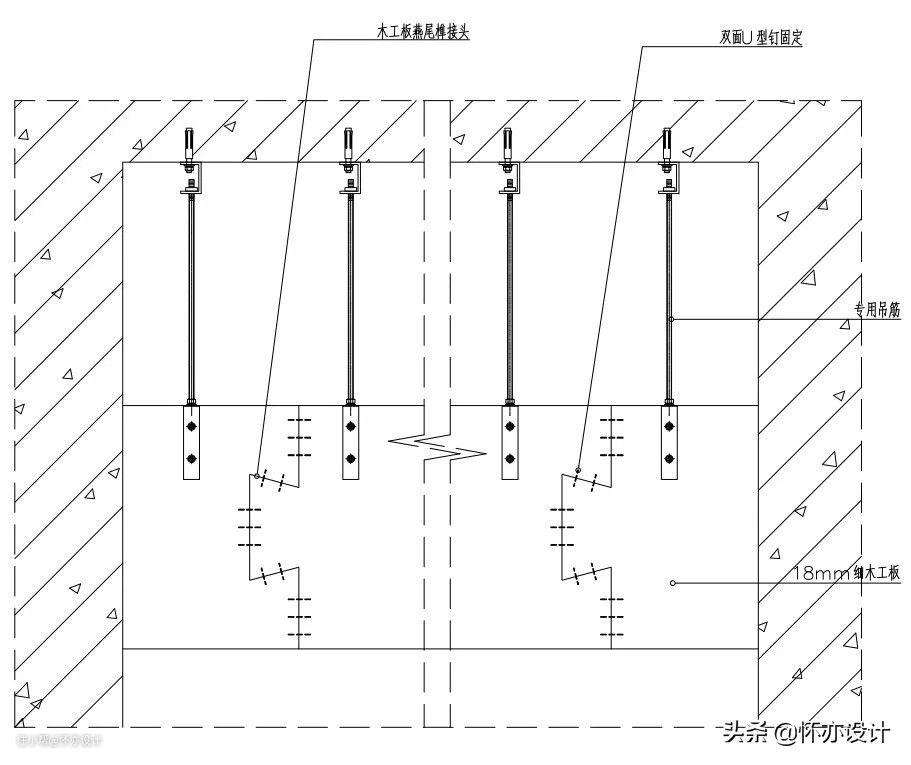 2)根据尺寸,提前在原建筑墙面上钉上木龙骨。龙骨吸顶吊件用膨胀螺栓与钢筋混凝土板固定;