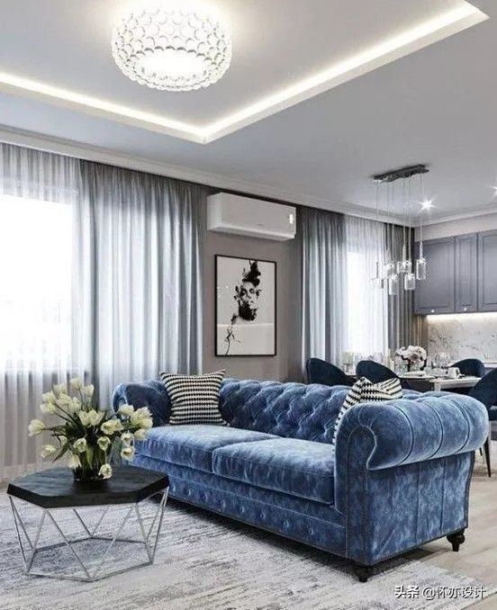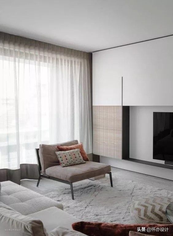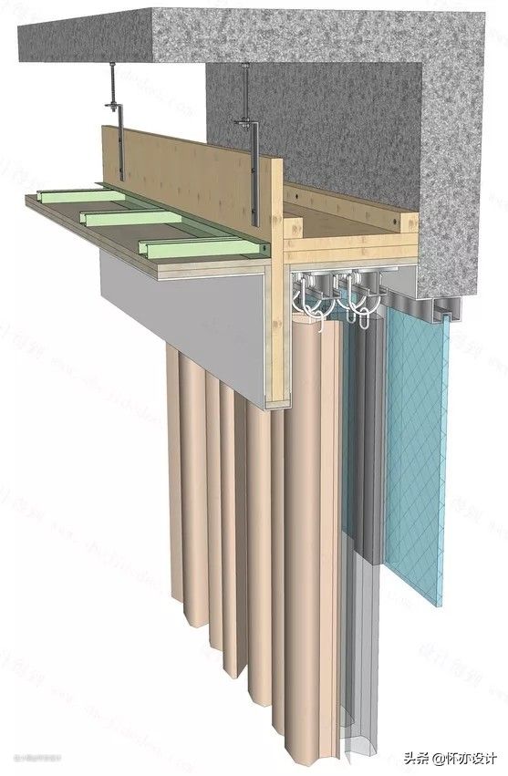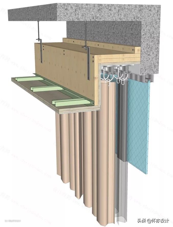 外接式内藏窗帘盒是在吊顶平面上,做出一条贯通墙面长度的遮挡板,在遮挡板内装好窗帘轨。