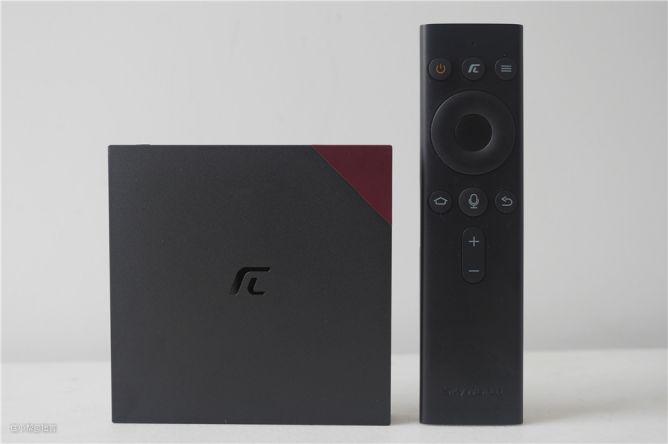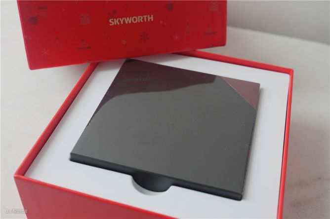 去掉塑料保护套,就可以看到创维小湃电视盒子MAX的样子了。四四方方的标准正方形,尺寸不大,黑色主色调,右上角用暗红色进行点缀,颇有点睛之意。