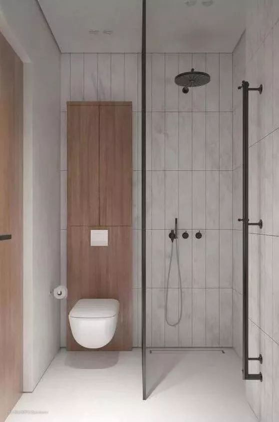 这么做虽然干区较为狭窄,但挂壁式马桶360度无清洁死角,隐藏水箱的设计使得冲水的噪音减至最低,有的后方的墙壁向前凸出一块(也有的可以做成不凸出),视觉上形成一个假性“柜子”,刚好可以放置香氛消除气味,还可以装顶灯调节光线。无论从哪个角度看来,都能更好地满足住户各方面的实用需求,这就能称得上是好的设计。