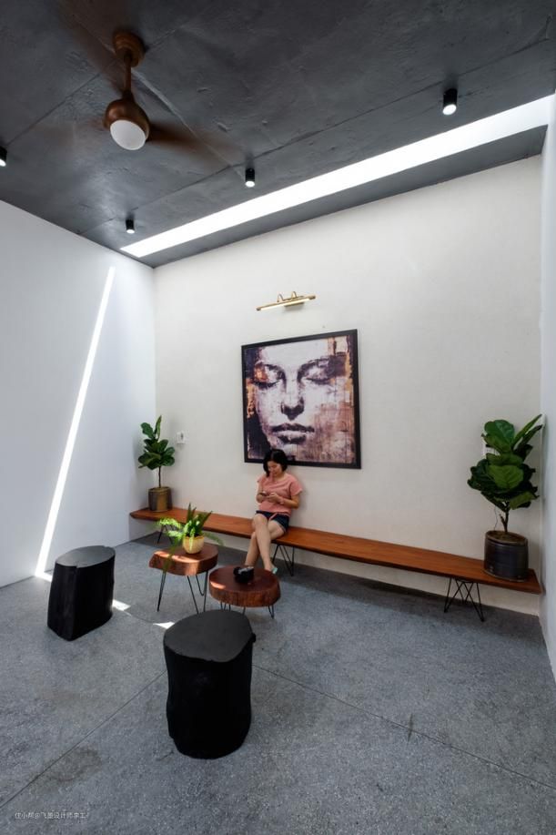 亮点二:客厅里并没有预想中舒适的大沙发,而是一张长木板,加上几个木凳子就完了,另外天花板上还开了一扇长达5m的天窗,光线一下子变得好多了。
