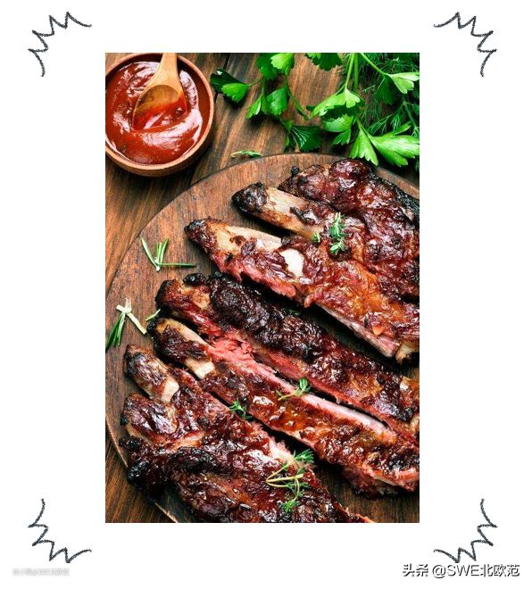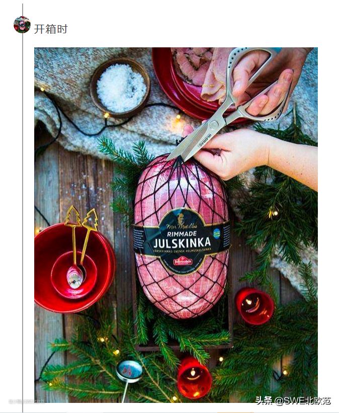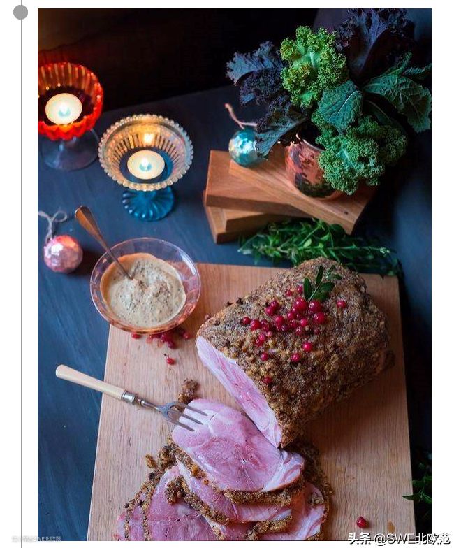 他说:边边上有调料,以及很有仪式感。日常生活中瑞典人也吃这种火腿,唯一区别是没有外面那一层香料,也就是裸边火腿。外面那圈调料一般是:杜松子,桂叶,蛋黄,面包屑,黄芥末酱,
