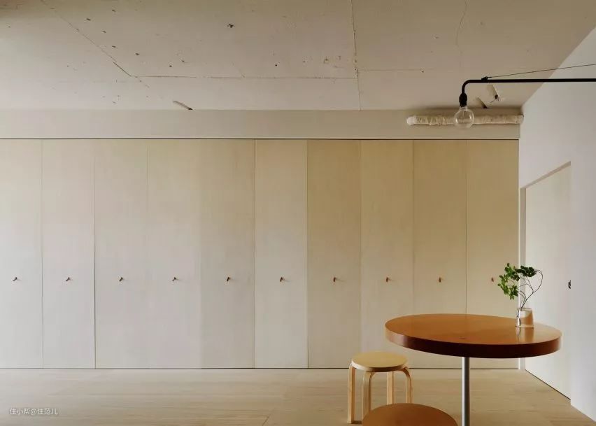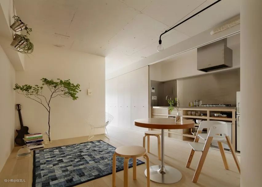 厨房和客厅相隔较近,厨房环境在视觉上容易杂乱,不使用厨房时,把折叠门一关,瞬间缓解了视觉压迫感,也符合整个房间的日式极简风格。