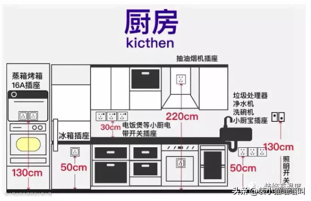 插座:通常要预留6~8个插座。其中燃气热水器、油烟机、冰箱插座各1个为必备,其他根据需要布置,用于电饭煲、微波炉等常用电器,并预留足够的备用插座。