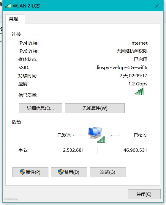 ▼首先是理论的连接速率,由于AX200网卡是支持2*2 MU-MIMO。因此可以看到在80Mhz下连接wifi6网络的速率已经达到了理论的1.2G。比较遗憾的是Velop MX5300不支持160Mhz下的工作模式,因此也就无法达到2.4G的连接速度了。