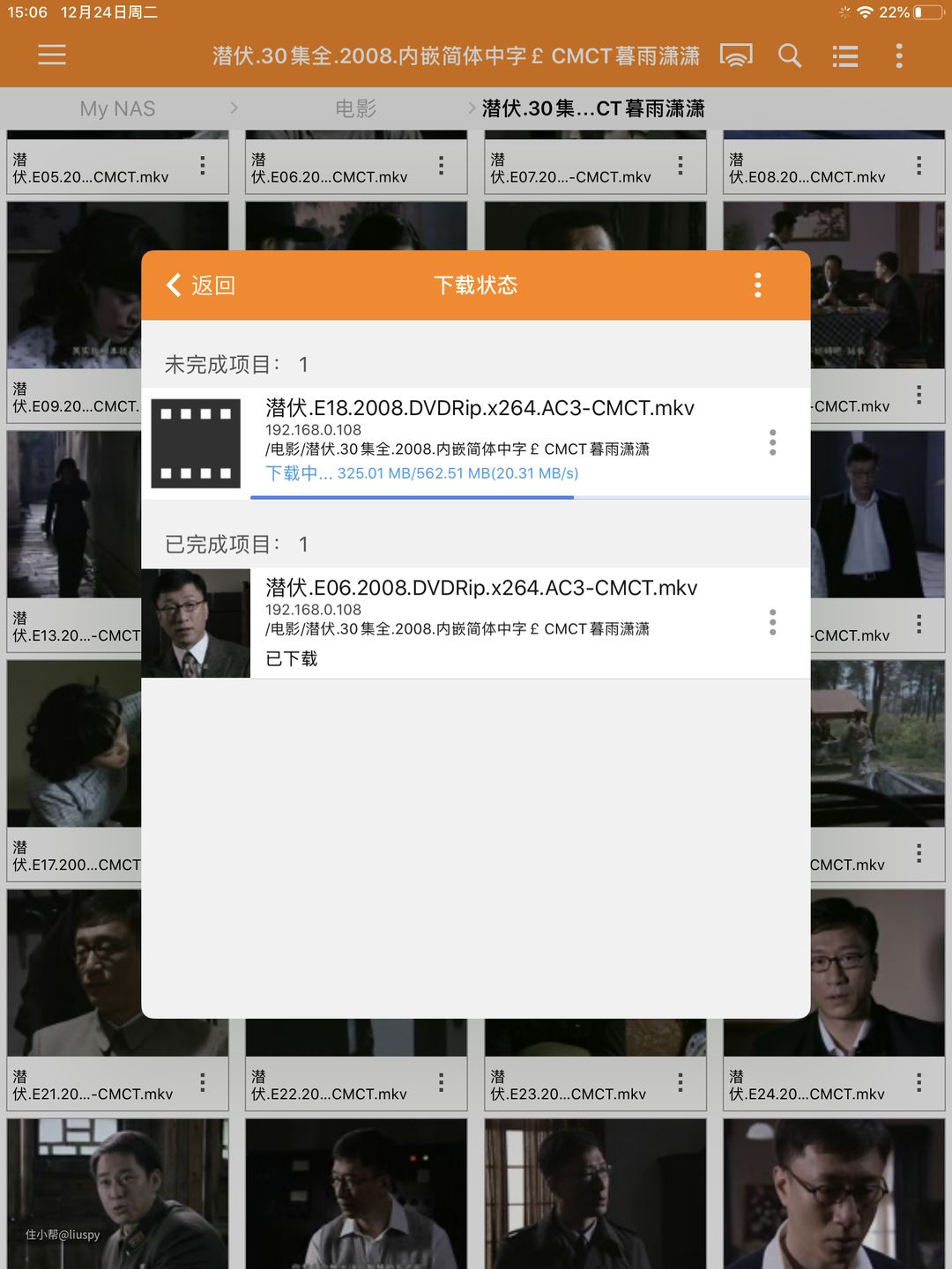 测试方案: 使用IPAD mini5连接子节点,下载局域网NAS中的影视文件,其中子节点与母节点连接方式为无线连接。