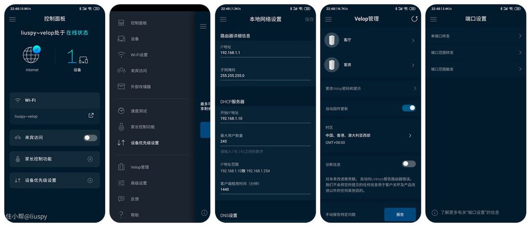 通过手机端APP可以实现许多基础的控制设置内容,如:端口转发、本地网络设置、家长及来宾控制等